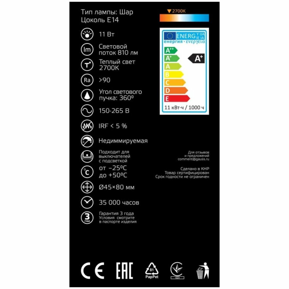 Ниже Вы можете прочитать отзывы на Светодиодная лампа Gauss LED Filament Шар E14 11W 720lm 2700K (упаковка 10 шт.), ознакомится с подробными характеристиками, посмотреть интересные обзоры и фотографии на Светодиодная лампа Gauss LED Filament Шар E14 11W 720lm 2700K (упаковка 10 шт.).