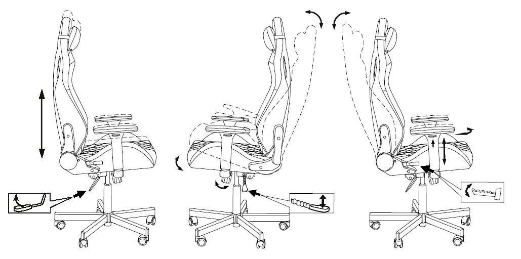 | Регулировка | высоты подлокотников / высоты поясничного упора / глубины сиденья / жесткости качания / наклона спинки / угла подлокотников |