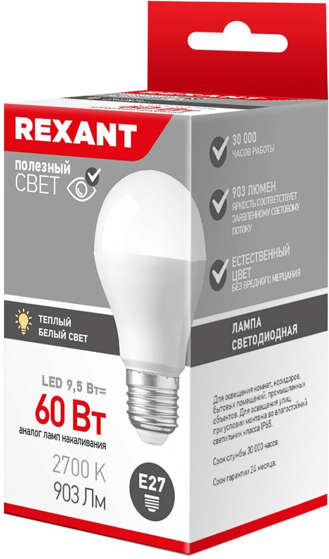 Лампочка E27 Светодиодная REXANT Груша A60 9,5 Вт 903 лм 2700 K теплый свет