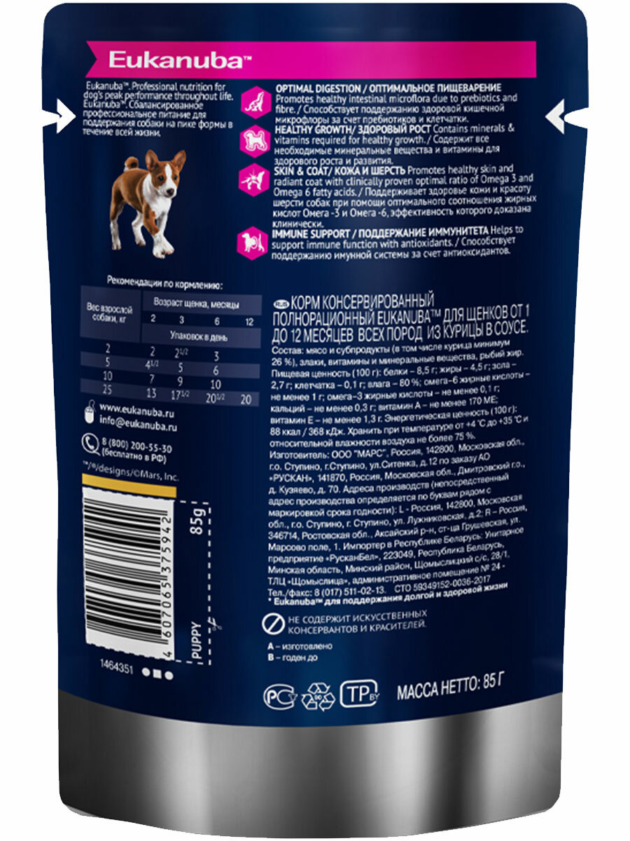 Eukanuba Dog пауч для щенков (кусочки в соусе) Курица, 85 г. упаковка 24 шт