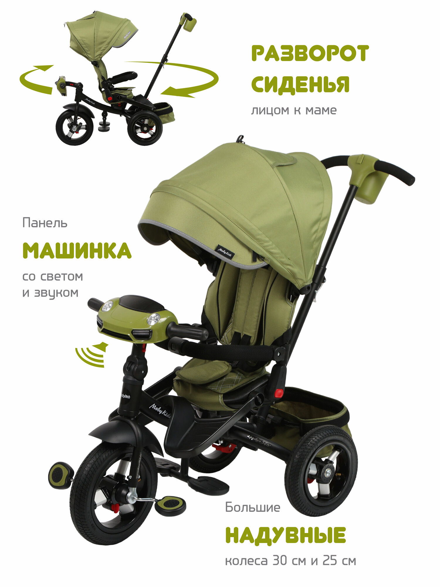 Велосипед Moby Kids 3-х колесный, Leader 360°, колеса 12"/10", AIR Car, оливковый (641486)