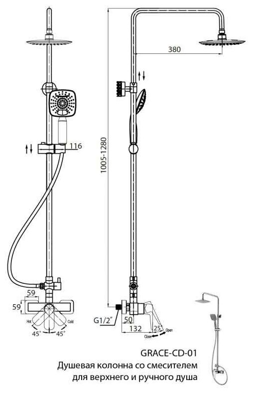 | Дополнительная информация | высота стойки для душа: 1280 мм; длина верхнего душа: 197 мм; ширина верхнего душа: 197 мм |