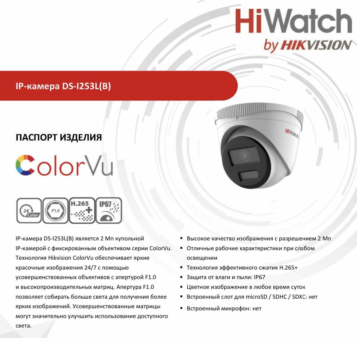 HiWatch DS-I253L(B) (2.8 мм) 2Мп уличная IP-камера с LED-подсветкой до 30м и технологией ColorVu (сертифицированная)