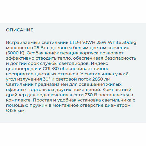 Светодиодный светильник LTD-140WH 25W White 30deg