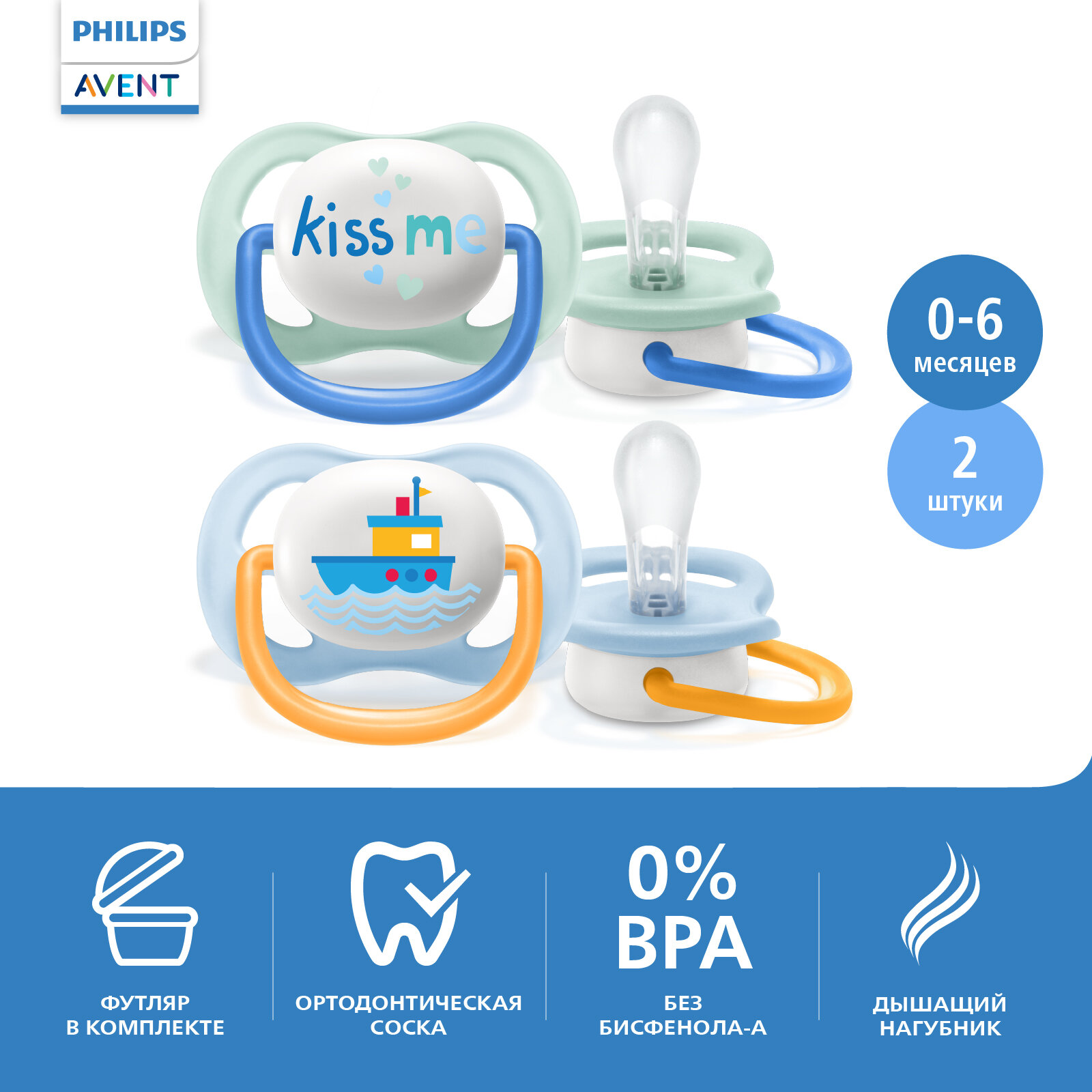 Детский товар Philips Пустышка ultra air Lime, Kiss me/Кораблик, 0-6 мес, 2 шт, для мальчиков