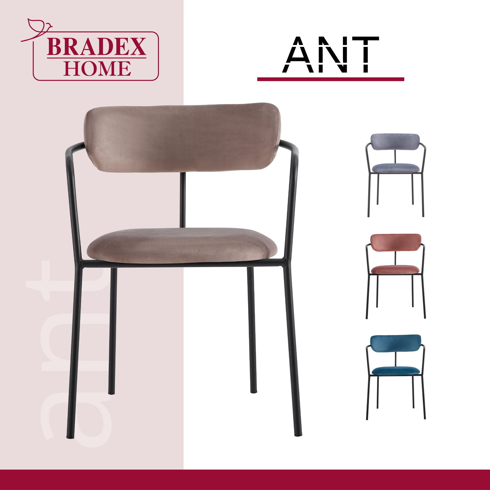 Стул-кресло Ant BRADEX HOME розовый, ткань, металл, мягкое сиденье, с подлокотниками