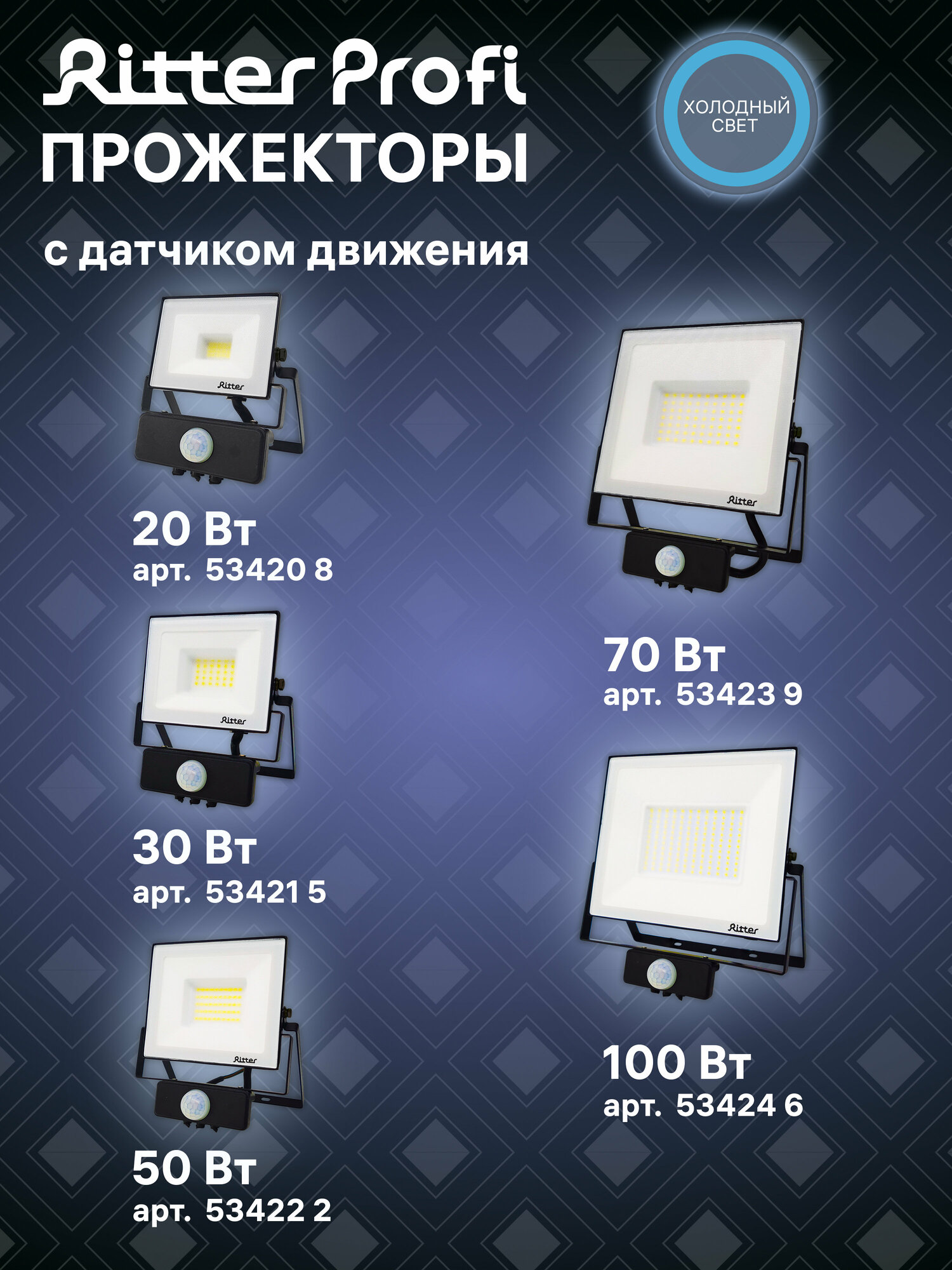 Ritter Прожектор светодиодный 50Вт уличный, с датчиком движения, холодный свет 6500К, IP65, серия PROFI 53422 2