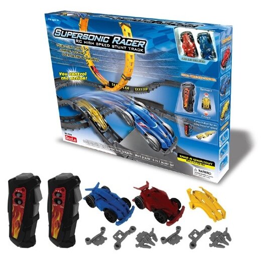| Комплектация | трасса из прочного эластичного пластика, 2 модели автомобиля с электродвигателем, 2 пульта управления |