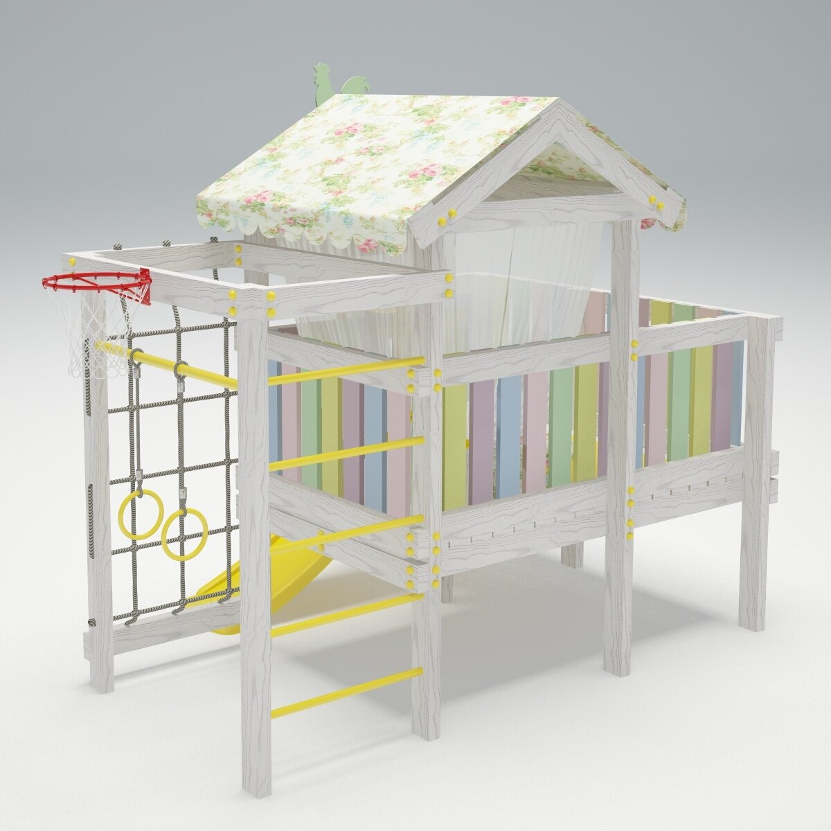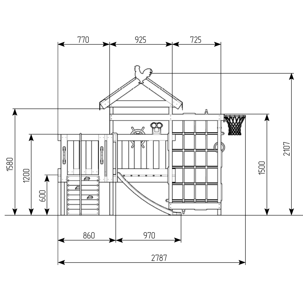| Комплектация | игровой домик с крышей и балдахином (высота платформы 600 мм), горка пластиковая 1.18 м, балкон с игровыми элементами, скаладром с канатом шведская стенка, сетка-лазалка, турник металлический, кольца гимнастические, баскетбольное кольцо, штурвал пластиковый малый 352х75 мм, бинокль |