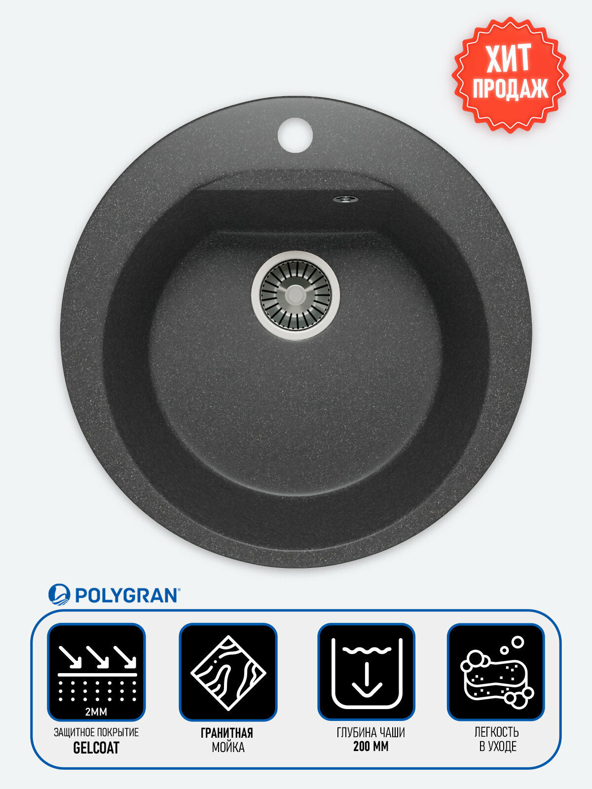 Мойка для кухни каменная POLYGRAN ATOL-520, серая, врезная, круглая (№16 Черный)