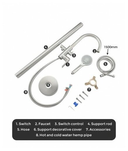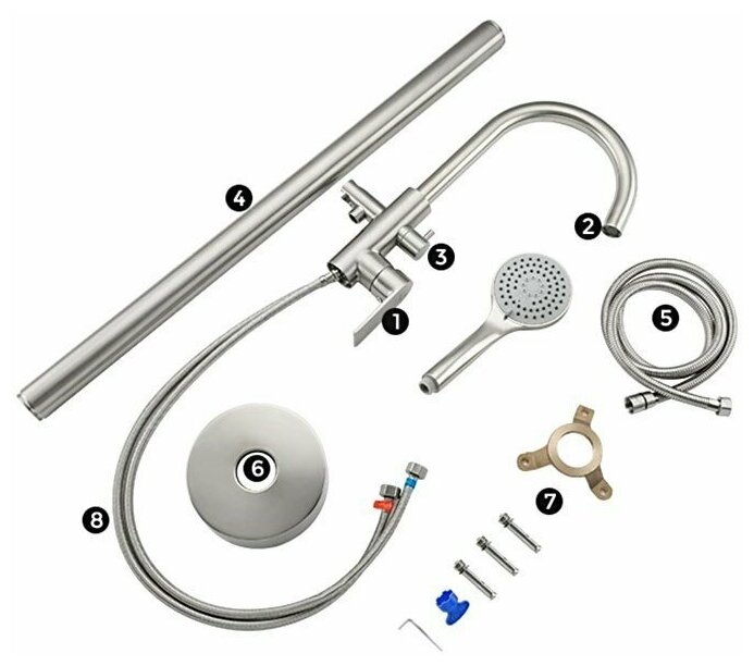 | Комплектация | Гибкая подводка 1/2, душевая лейка, держатель лейки, душевой шланг 150 см |