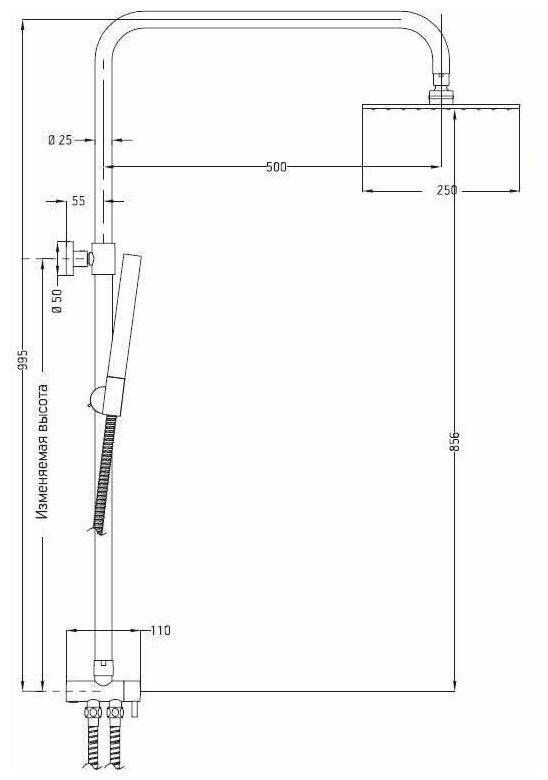 | Дополнительная информация | высота стойки для душа: 950 мм; длина верхнего душа: 250 мм; ширина верхнего душа: 250 мм |