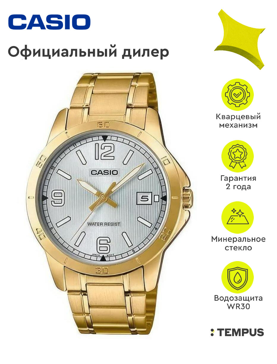 Наручные часы CASIO MTP-V004G-1B кварцевые, водонепроницаемые, подсветка стрелок, золотой