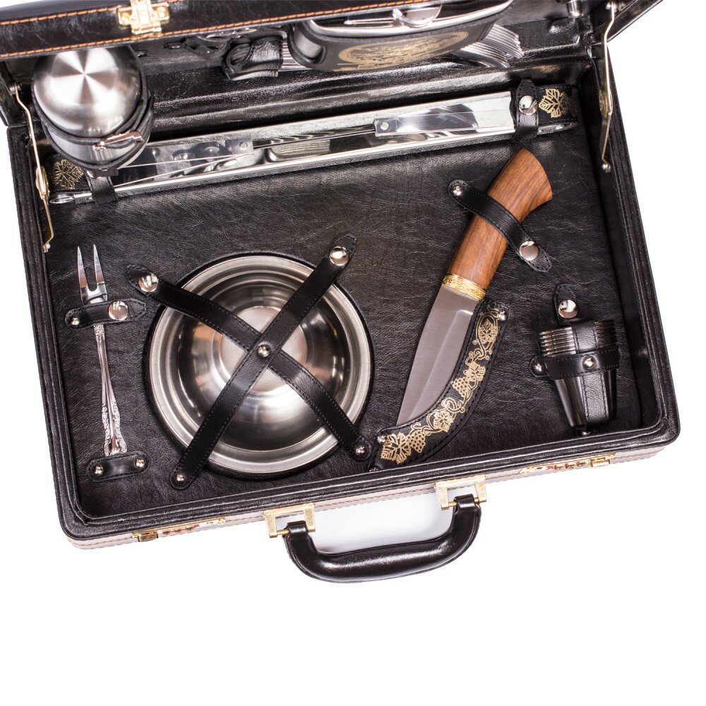 | Комплектация | 1. Кейс из кожзаменителя с внутренней отделкой из искусственной кожи и тиснением изображения 1шт. 2. Термос из нержавеющей стали 0,35 л 1шт. 3. Фляжка из нержавеющей стали 0,5 л 1шт. 4. Вилки из нержавеющей стали 6шт. 5. Ложки из нержавеющей стали 6шт. 6. Стаканы из нержавеющей стали 240 мл 6шт. 7. Мангал складной из нержавеющей стали 1шт. 8. Шампура из нержавеющей стали 6шт. 9. Нож охотничий из нержавеющей стали и рукоятью из ореха и латуни 1шт. 10. Тарелки из нержавеющей стали 6шт. 11. Воронка из нержавеющей стали для заполнения фляжки 1шт. 12. Штопор сомелье 1шт. 13. Вилка из нержавеющей стали для мяса 1шт. 14. Чехол для кейса из высокопрочного прозрачного пластика предназначенный для защиты от влаги и сохранения товарного вида 1шт. |