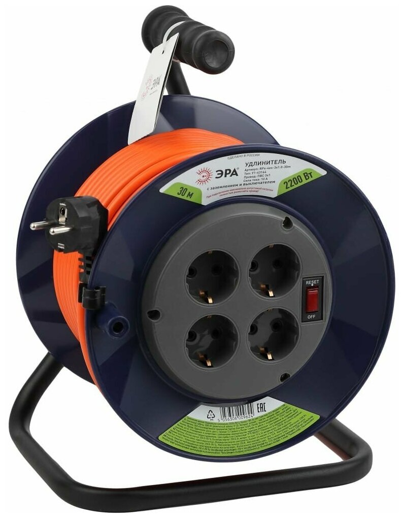 Удлинитель на катушке ЭРА 4 гнезда 30 м ПВС 3x1 кв.мм 10 А 2200 Вт IP 20 с заземлением, 1286095
