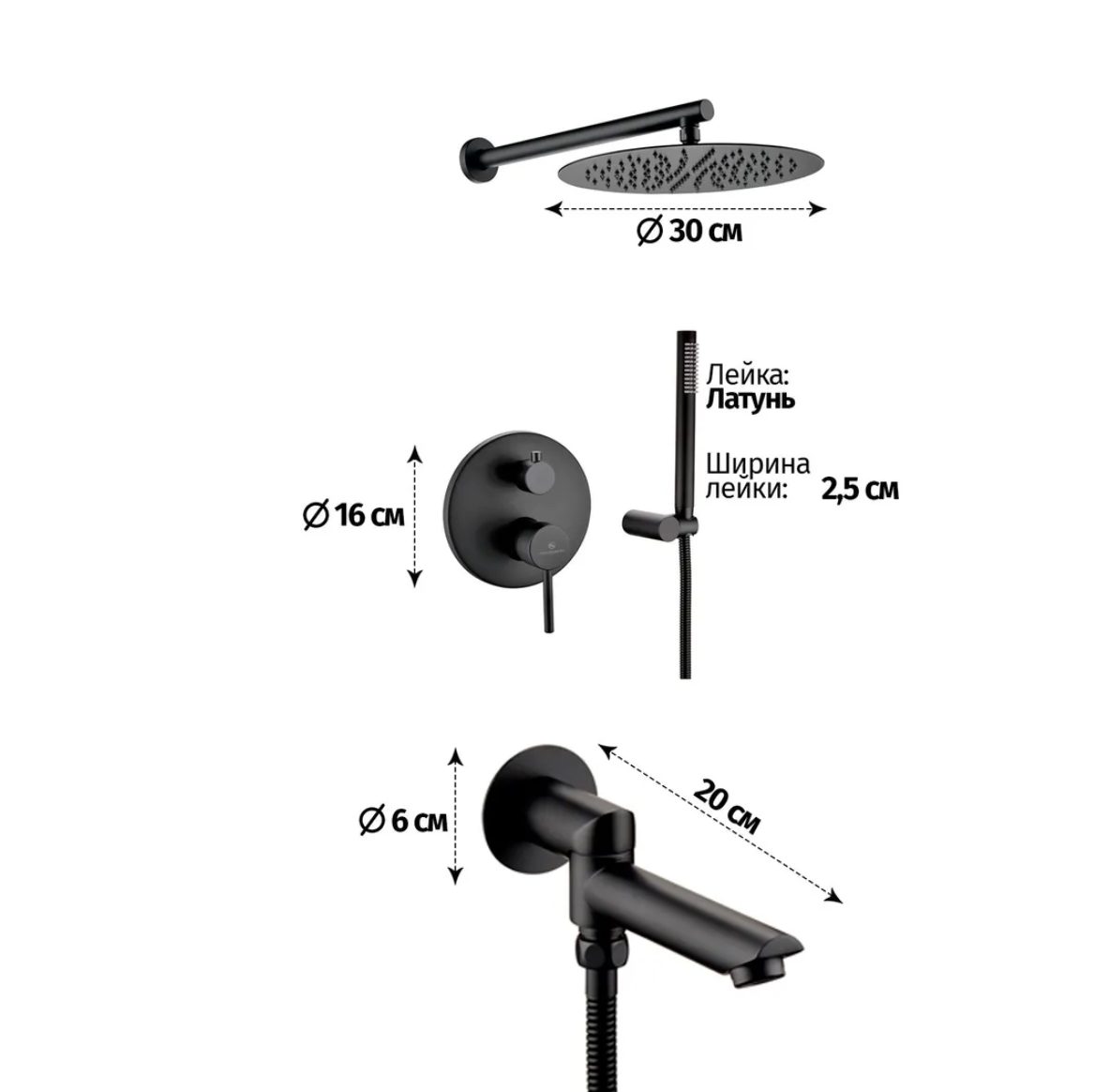 | Комплектация | вентиль / верхний душ / держатель лейки / излив для набора воды / кронштейн / лейка / ручной душ / шланг |