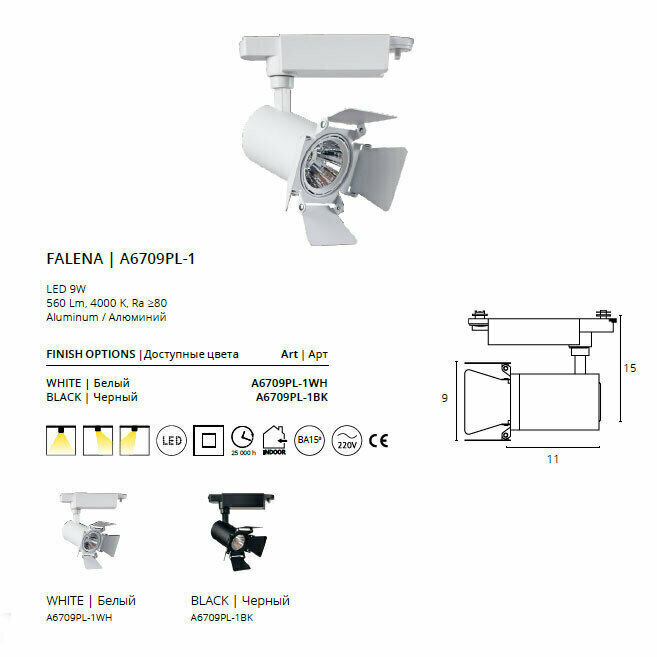 Трековый светильник A6709PL-1WH 9W 4000K