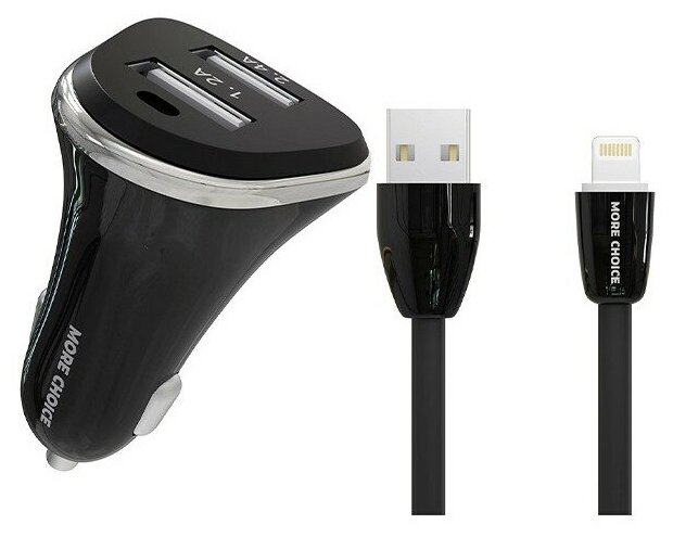Автомобильная зарядка (от прикуривателя) More choice AC22i, два разъема USB, кабель Lightning, 2.4A, черный