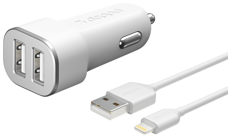 Автомобильное зарядное устройство для Apple Deppa 2 USB 2.4А + кабель Lightning MFI белый (11291)