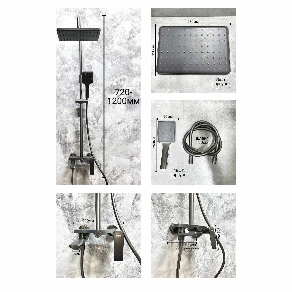 | Комплектация | с душевой лейкой / с шлангом для душа / верхний душ / душевая стойка / Смеситель |