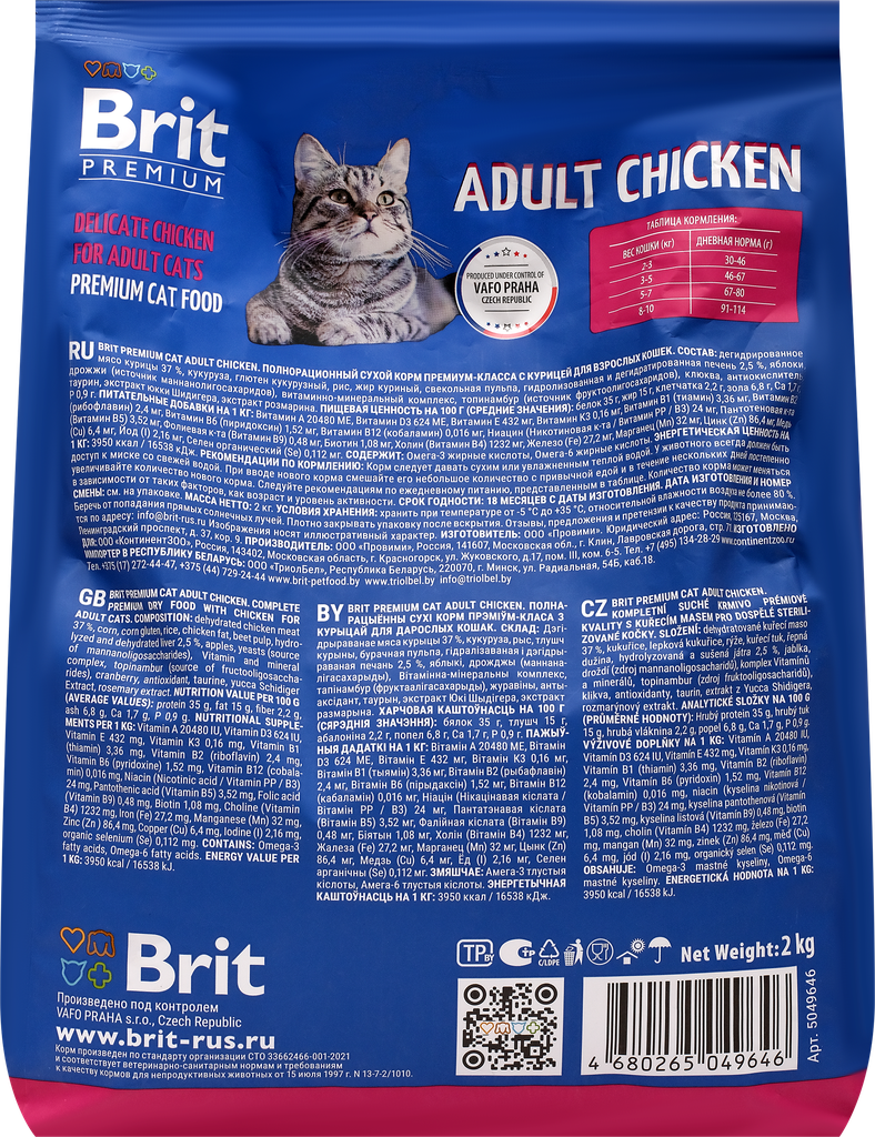 BRIT PREMIUM, Сухой корм с курицей для взрослых кошек "Cat Adult Chicken", 2кг, 5049646