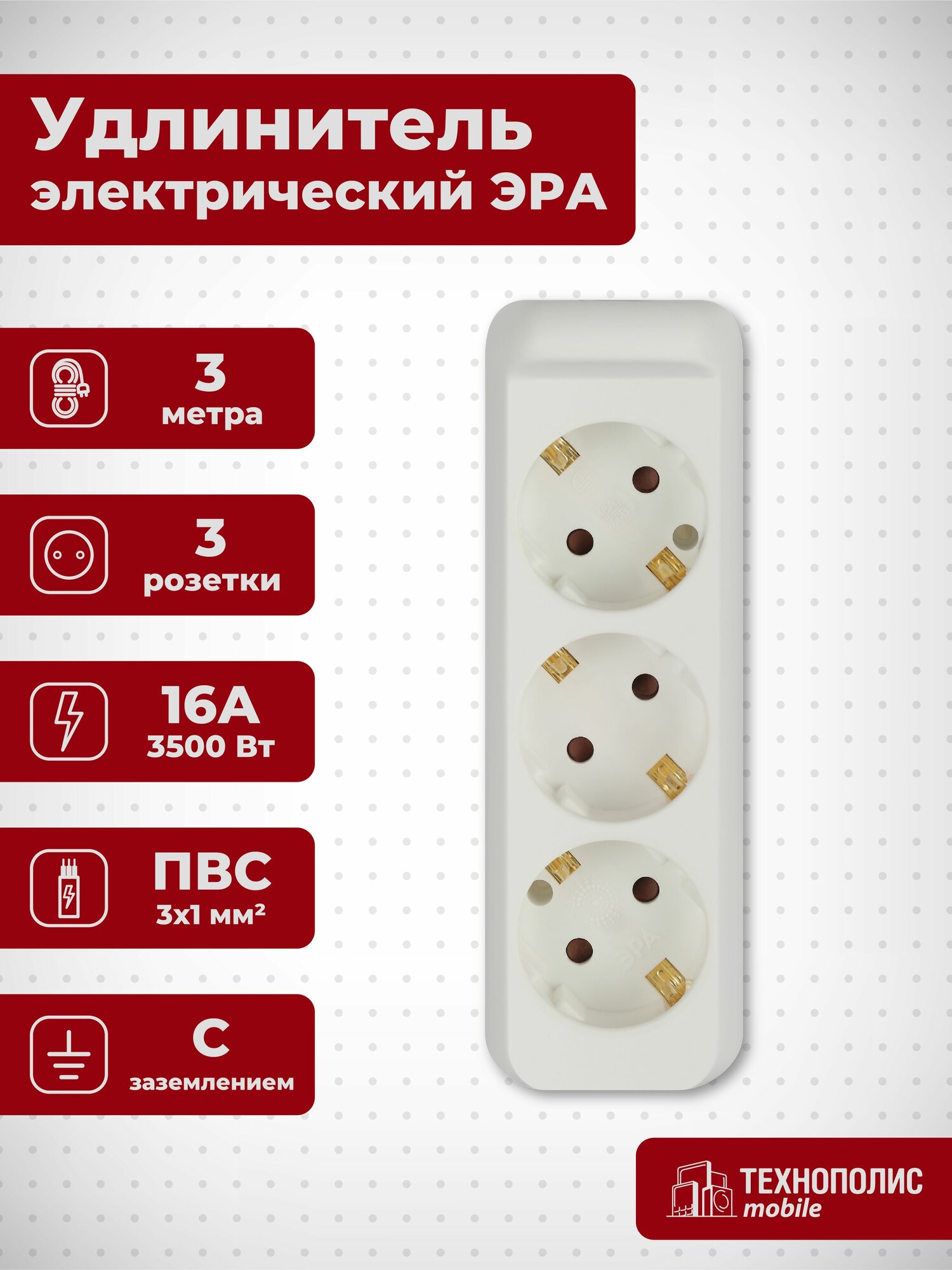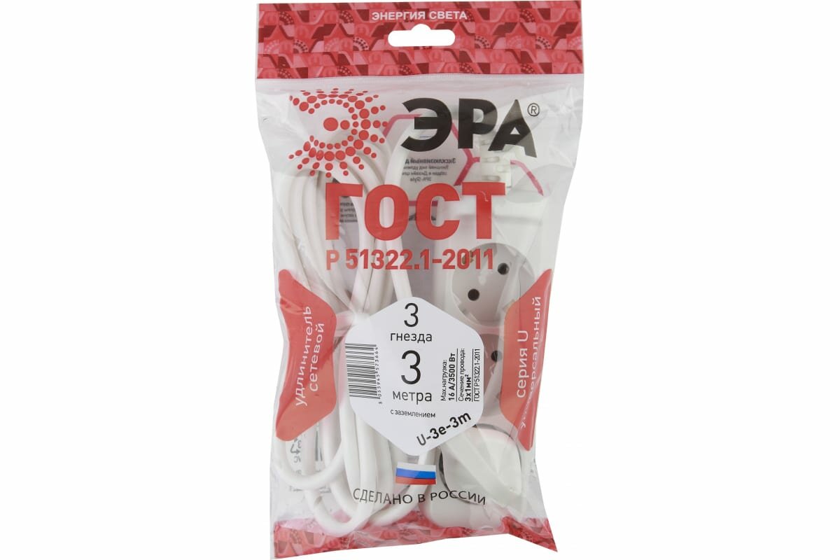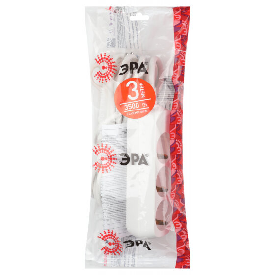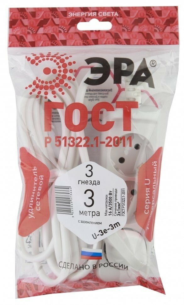 ЭРА U-3e-3m Удлинитель c заземлением., 3гн, 3м, ПВС, 3х1мм2, 16А