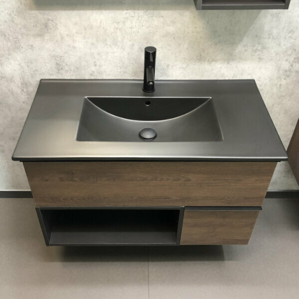 Тумба с раковиной Comforty Порто 90 9110 подвесная дуб темно-коричневый/черный муар