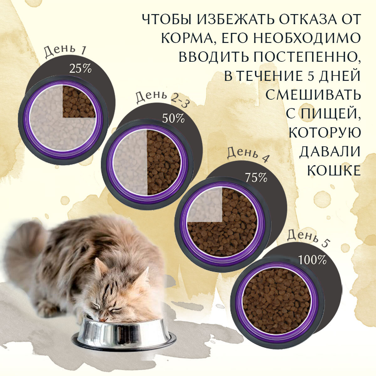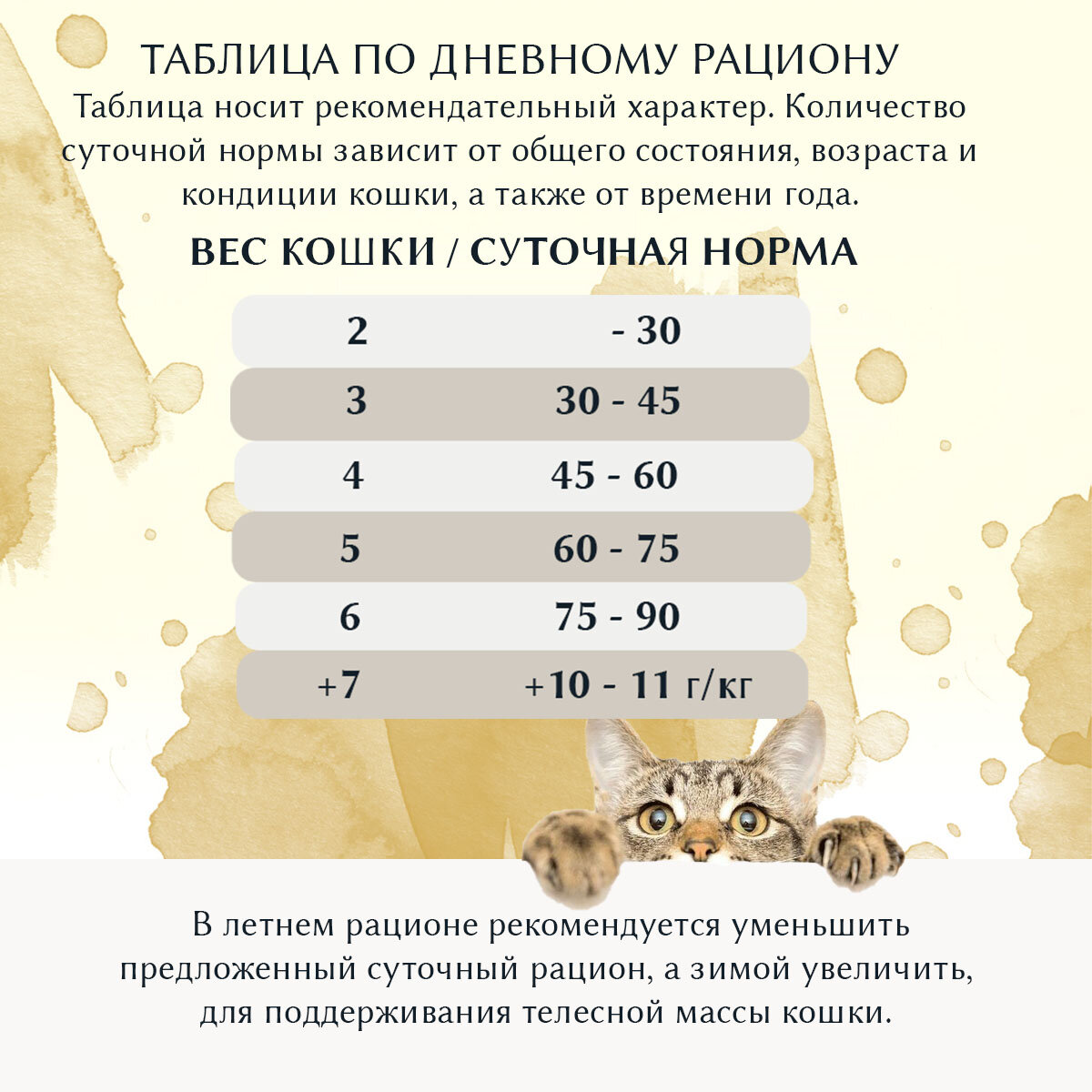 | Дополнительная информация | РЕКОМЕНДАЦИИ ПО КОРМЛЕНИЮ: корм вводить постепенно, в течение 5 дней смешивать с пищей, которую давали кошке ранее, после чего можно давать корм отдельно. Таблица по дневному рациону носит рекомендательный характер. Количество суточной нормы зависит от общего состояния, возраста и кондиции кошки, а также от времени года. В летнем рационе рекомендуется уменьшить предложенный суточный рацион, а зимой увеличить, для поддерживания телесной массы кошки. |