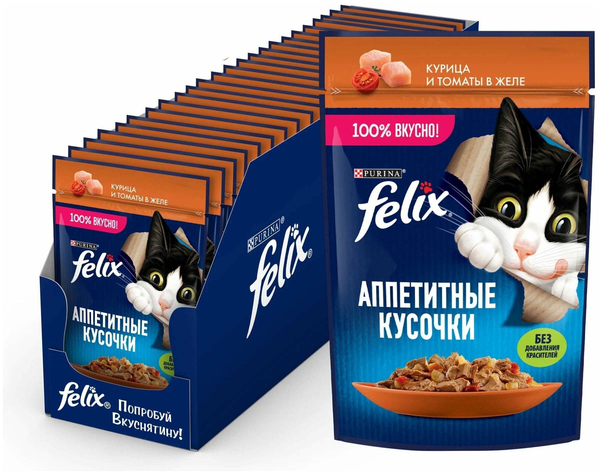 Корм для кошек FELIX Аппетитные кусочки с курицей и томатами в желе, пауч 85 г (упаковка - 26 шт)