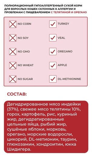 | Состав | Дегидрированное мясо индейки (37%), свежее мясо телятины 10%, горох, картофель, рис, куриный жир, дегидратированные цельные яйца, рыбий жир, сушёные яблоки, морковь, орегано, морские водоросли, цикорий, DL-метиононин, таурин, глюкозамин, хондроитин, юкка Шидигера. |