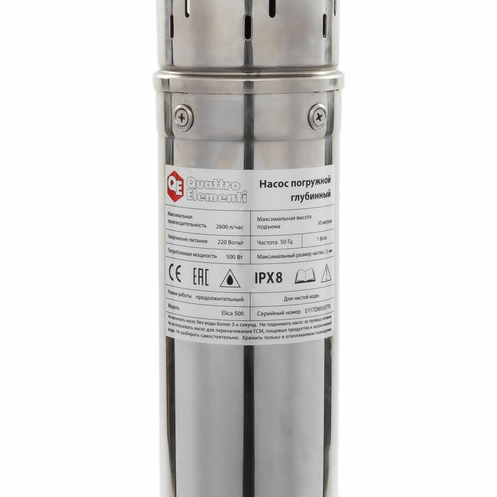 Глубинный насос QUATTRO ELEMENTI ELICA 500(500 Вт, 2600 л/ч, для чистой, 50 м, 7.8 кг, нерж.корпус, провод 10м)