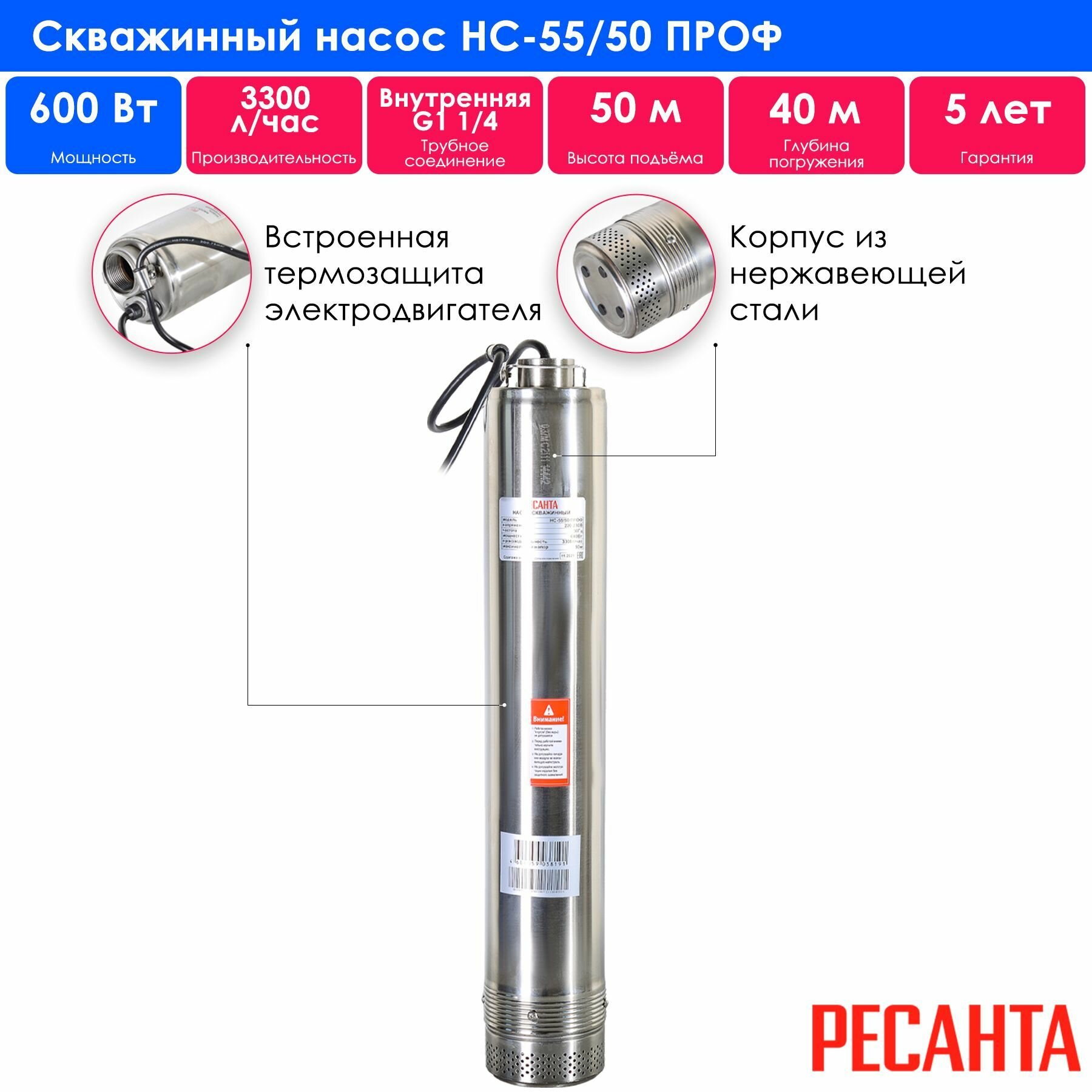 Скважинный насос Ресанта НС-55/50 ПРОФ, 600 Вт, высота подъема – 50 м, 3300 л/час, 1,25”