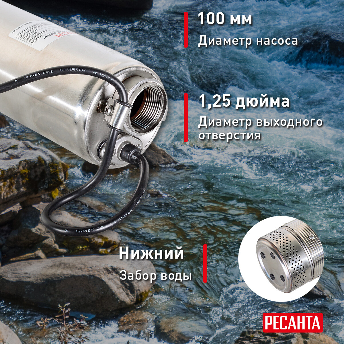 Насос / Скважинный насос Ресанта НС-55/80 ПРОФ (1100 Вт, высота подъема – 80 м, 3300 л/час, 1,25”, глубина погружения в воду до 40 м, 4”)