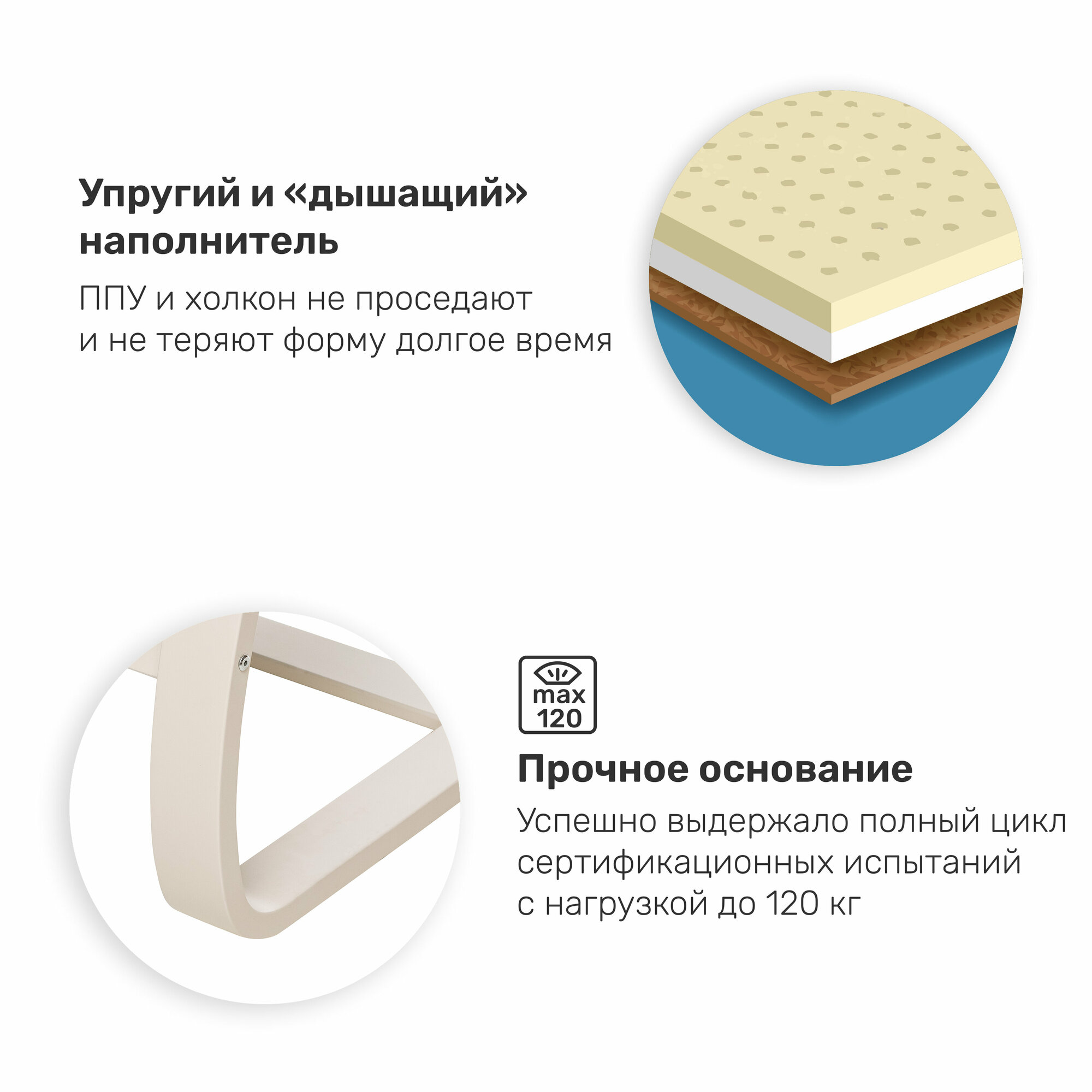 | Дополнительная информация | материал наполнителя: ППУ, холкон; высота от пола до сиденья — 45 см; глубина сиденья — 50 см; ширина сиденья — 54.5 см; высота спинки — 70 см; угол наклона спинки — 110°; ширина подлокотника — 7 см; толщина мягкого элемента — 11 см |