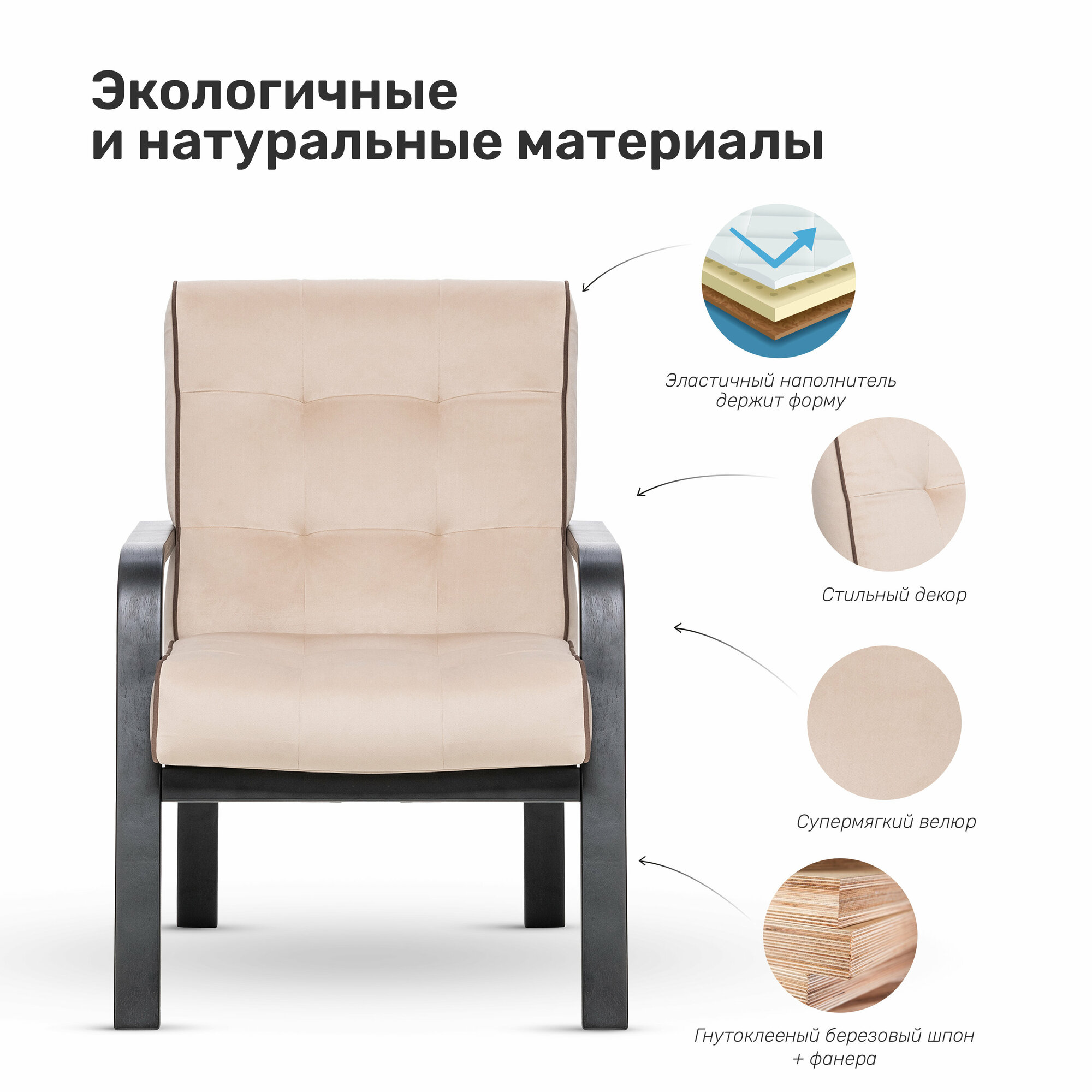| Дополнительная информация | высота от пола до сиденья - 46 см, ширина сиденья - 54 см, глубина сиденья - 48 см, высота спинки - 55 см; материал каркаса: фанера ФСФ, гнутоклееный березовый шпон; наполнитель: ППУ, холкон; страна производителя: Россия |