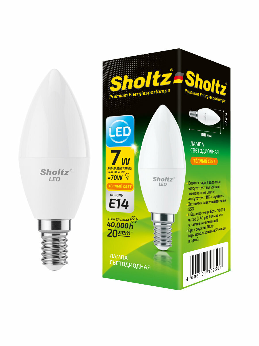 Лампа светодиодная энергосберегающая Sholtz 7Вт 220В C37 E14 2700К пластик(Шольц) LEC3025 интересное: