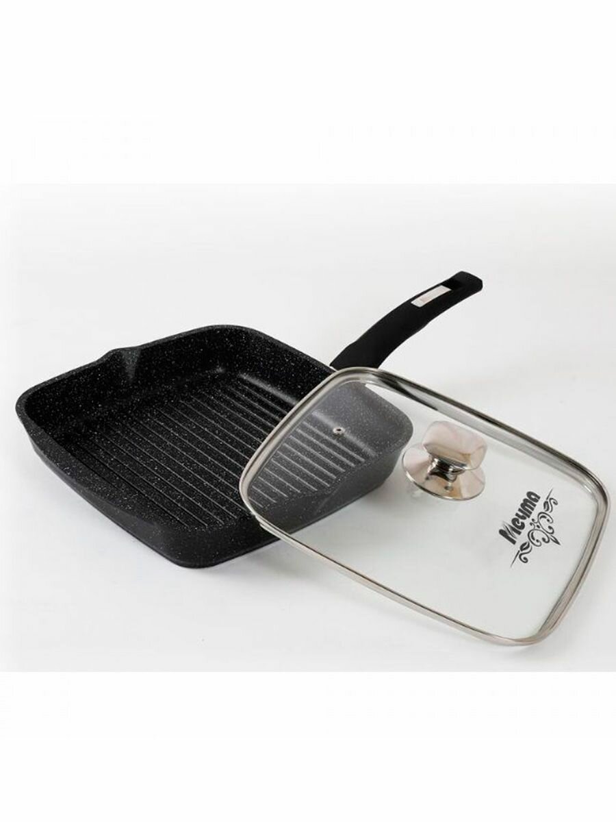 Сковорода гриль Мечта квадратная 28х28 см Гранит с антипригарным покрытием с несъемной ручкой и крышкой, НЕ индукционная