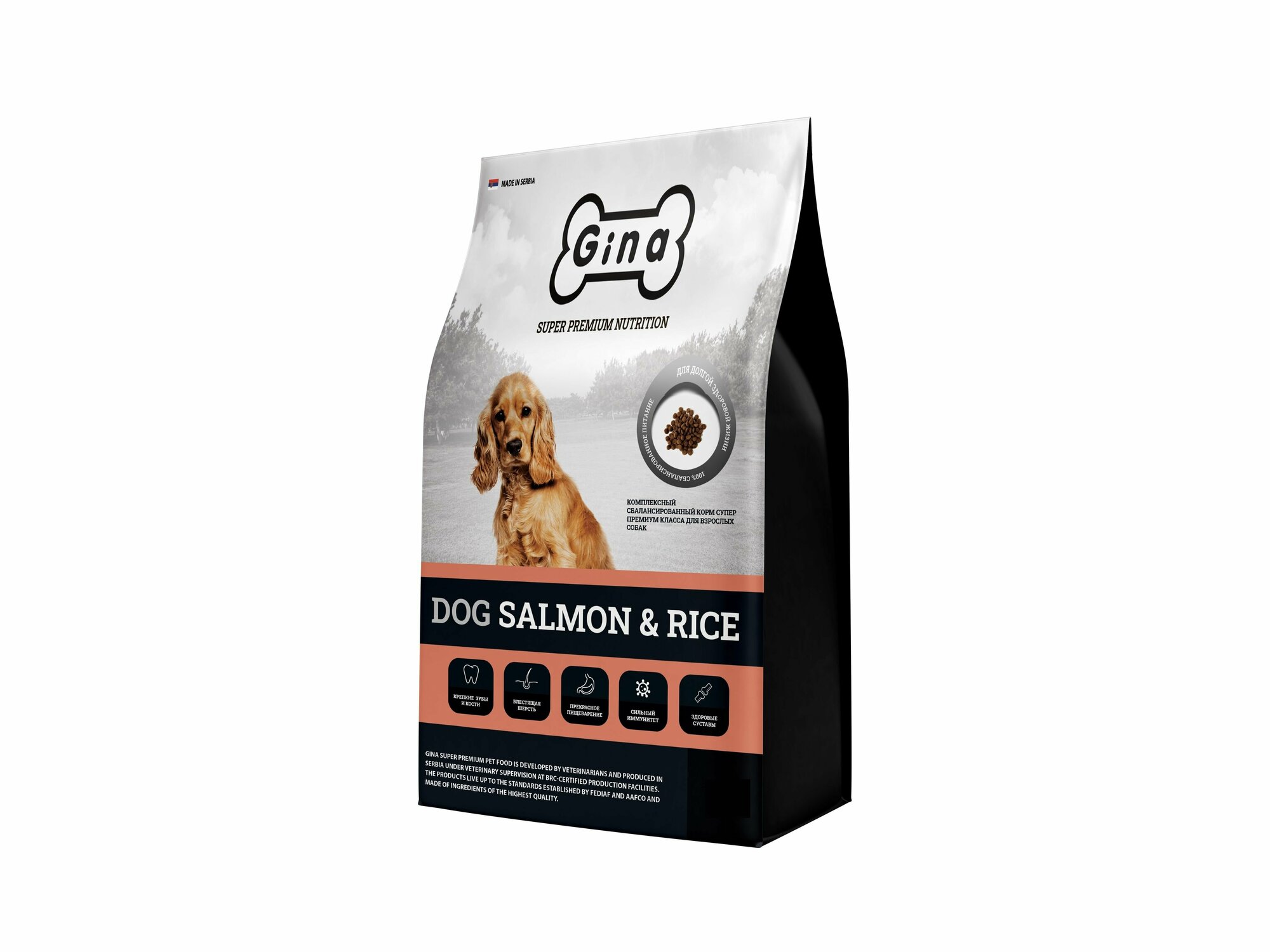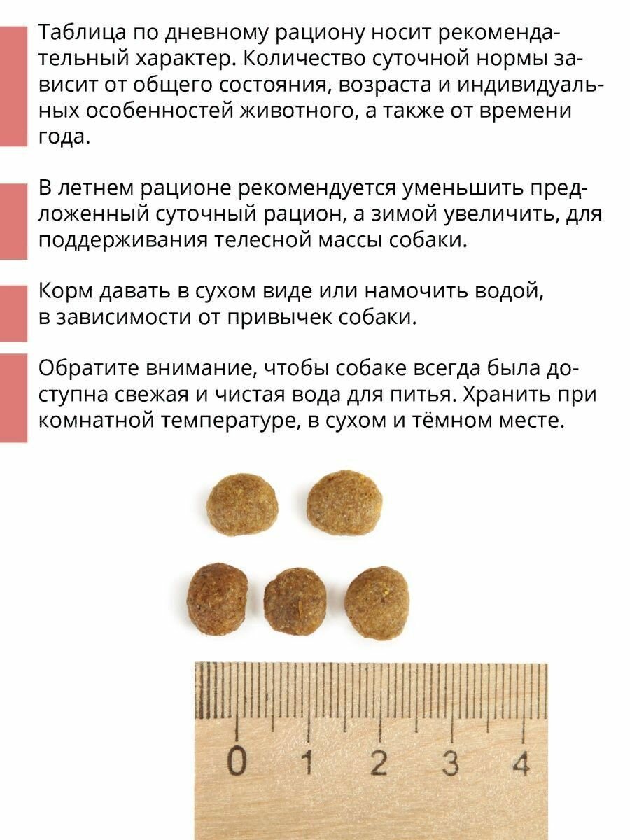 | Дополнительная информация | Корм вводить постепенно, в течение 5 дней смешивать с пищей, которую давали собаке ранее, после чего можно давать корм отдельно. Таблица по дневному рациону носит рекомендательный характер. Количество суточной нормы зависит от общего состояния, возраста и кондиции собаки, а также от времени года. В летнем рационе рекомендуется уменьшить предложенный суточный рацион, а зимой увеличить, для поддерживания телесной массы собаки. Gina Dog Salmon&Rice производится без синтетических и натуральных красителей, без добавления аминокислот, генетически модифицированных продуктов, усилителей вкуса и ароматов. Корм давать в сухом виде или намочить в воде, в зависимости от привычек собаки. Обратите внимание, чтобы собаке всегда была доступна свежая и чистая вода для питья. Хранить при комнатной температуре, в сухом и тёмном месте. |