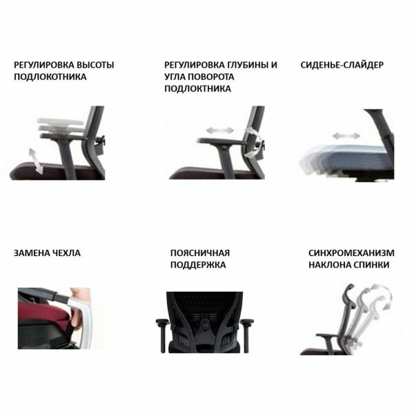 | Регулировка | высоты подголовника / высоты подлокотников / высоты сиденья / глубины положения подлокотников / глубины сиденья / жесткости качания / угла наклона подголовника / угла подлокотников |