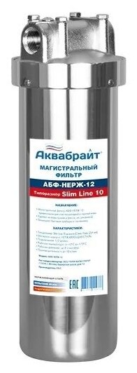 Магистральный фильтр Аквабрайт АБФ-НЕРЖ-12 из нержавеющей стали типоразмер SlimLine 10" 33668 интересное: