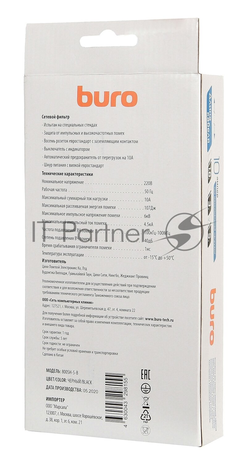 Сетевой фильтр Buro 800SH-5-B 5м (8 розеток) черный (коробка) .
