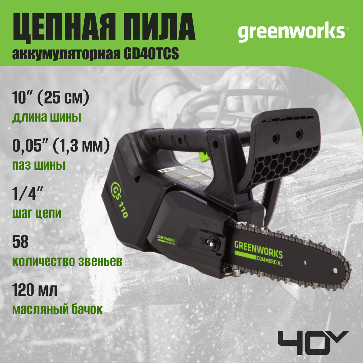 Цепная пила Greenworks GD40TCS 40V 2003807 (25 см) одноручная бесщеточная аккумуляторная без аккумулятора и зарядного устройства