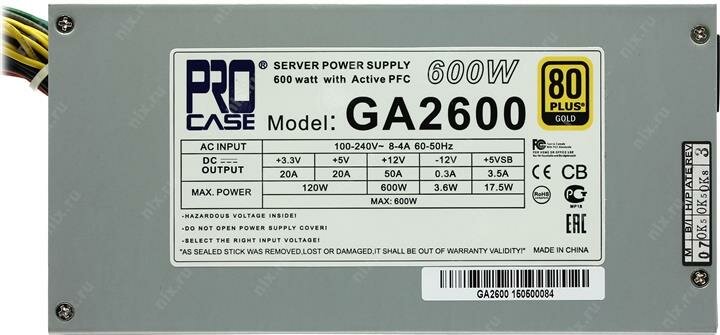 Procase Блок питания GA2600 Блок питания ATX 2U 2FAN 600W , 80+ Gold, 200 100 70mm, Активный PFC, +5B 20A, +12B 50A, +3,3B 20A, 5VSB 3.5A, -12B