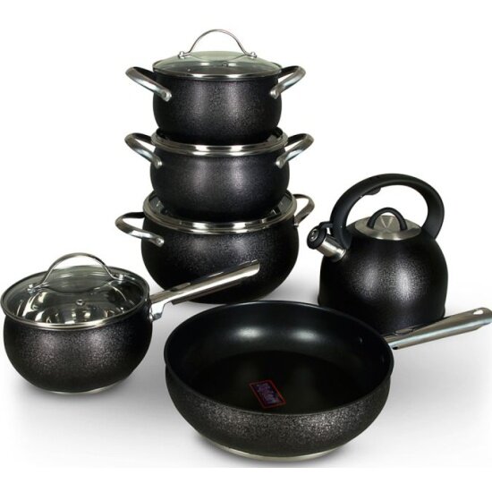 | Комплектация | 3 кастрюли: 3 л, 4 л, 6 л; ковш: 1.5 л; сковорода: 24 см; крышка (4 шт.); чайник: 3 л |