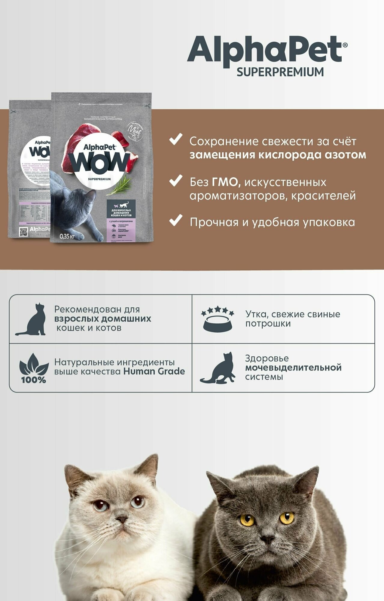 ALPHAPET WOW SUPERPREMIUM 350 гр сухой корм для взрослых домашних кошек и котов с уткой и потрошками