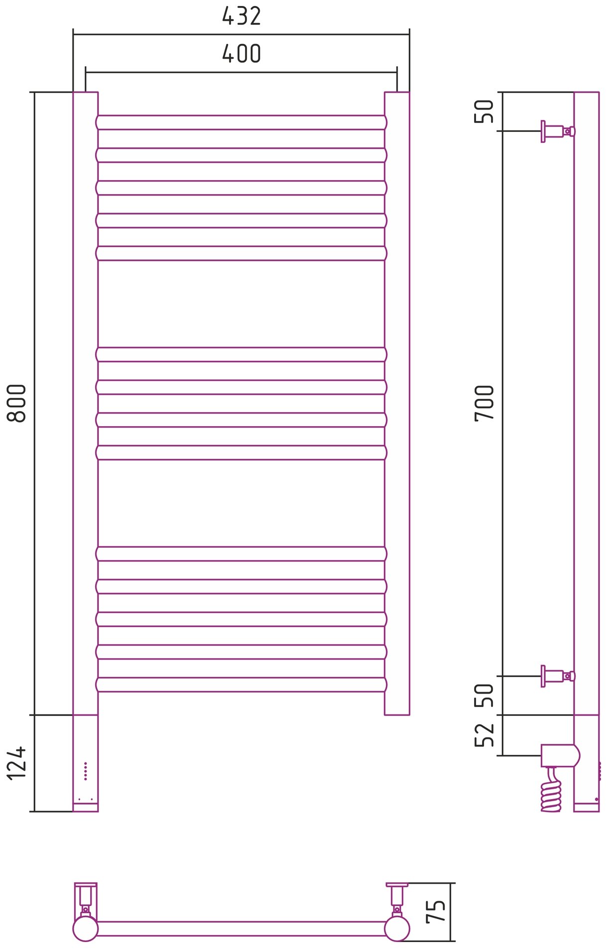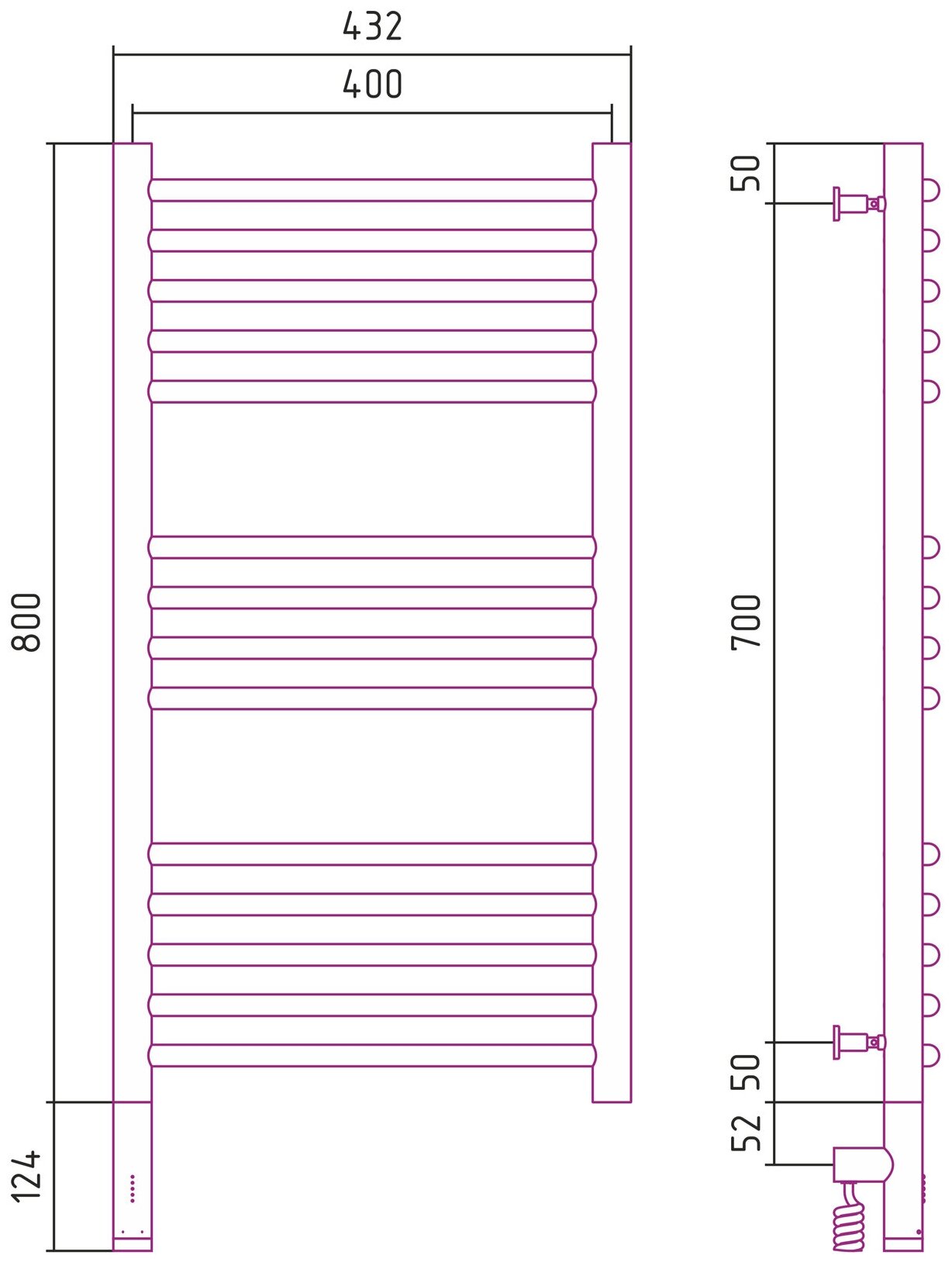 Полотенцесушитель электрический 800x400 МЭМ левый, перемычка прямая Сунержа Богема 3.0 00-5804-8040