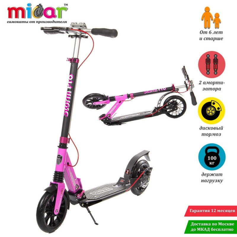 Двухколёсный самокат Micar Storm Pro Black-Pink с ручным дисковым тормозом и амортизаторами