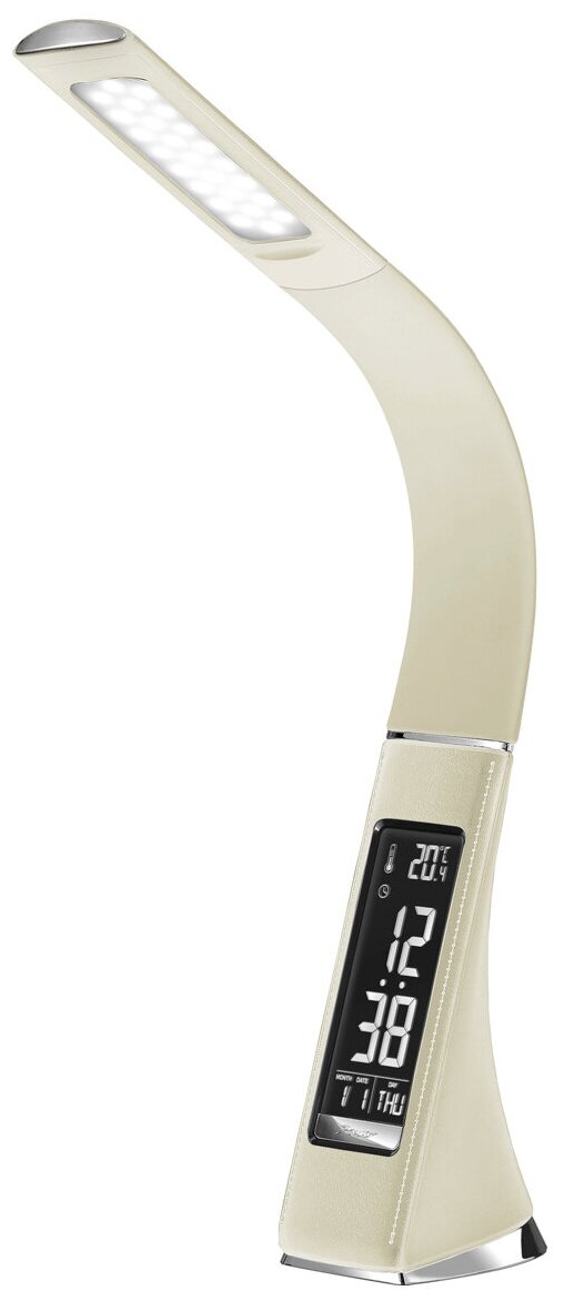 | Дополнительная информация | функция календаря; световой поток светодиодов эквивалентен лампе накаливания мощностью 40 Вт; корпус с кожаной фактурой; регулировка положения 360°; основание 90 x 65 мм, плафон 145 x 46 мм |