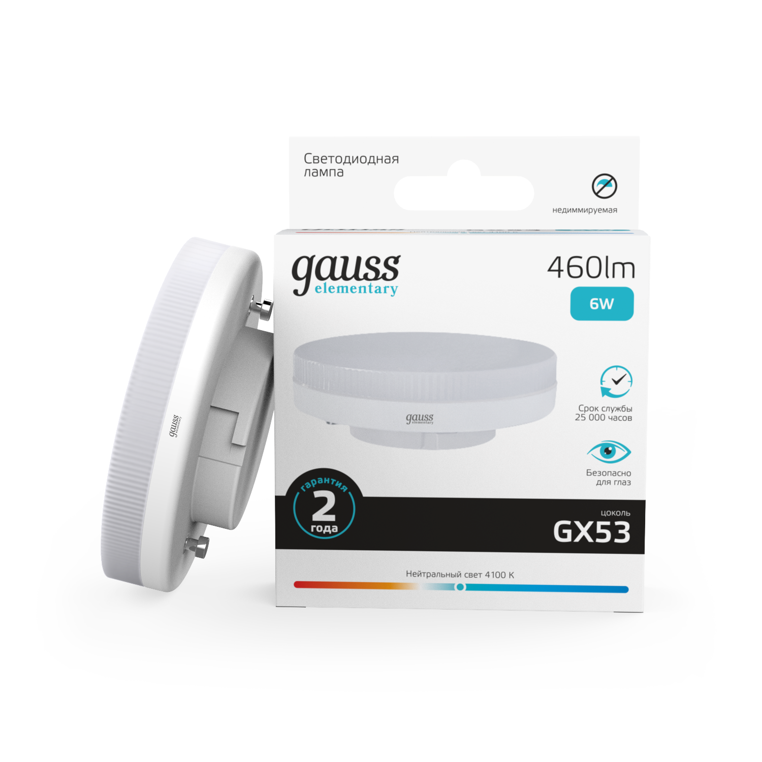 (2 шт)Лампа Gauss Elementary GX53 6W 460lm 4100K LED 1/10/100