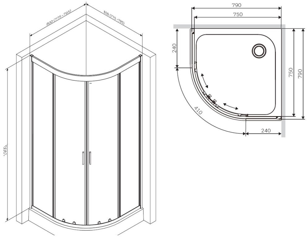 W90G-401-080BT Душевое ограждение Gem 1/4 Rond 80x80 стекло прозрачное, профиль черный матовый, без